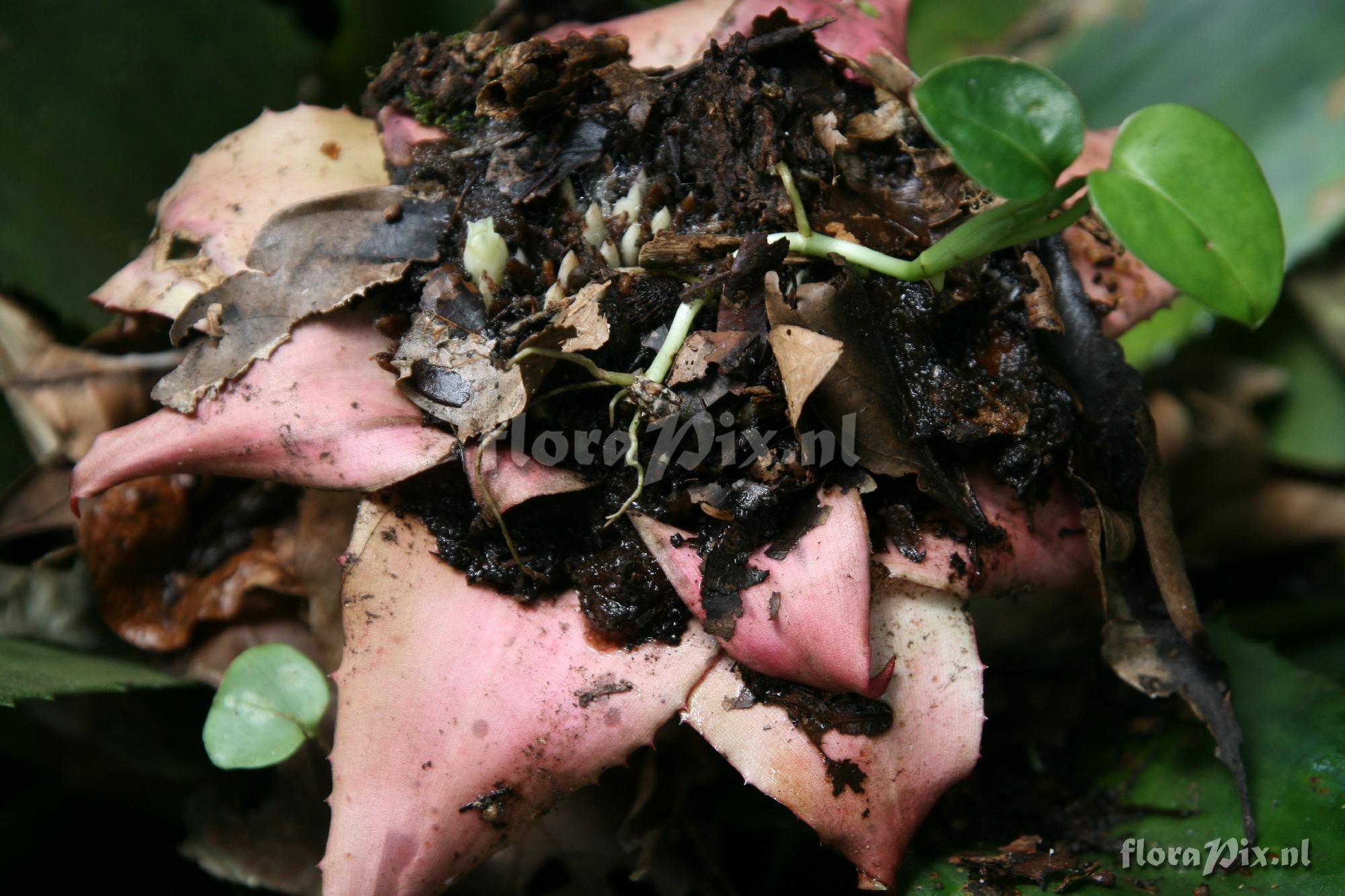 (Uploaded as: Edmundoa lindenii) Locality: Brazil - Rio de Janeiro - Serra dos Orgaõs Photographer: Uwe Note: The inflorescences are always covered with rotten leaves and seedlings are mostly present. Mind the white flower between the detritus leaves. Identification: solved
