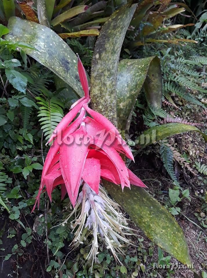 - Note (15551): (2018-11-10) - The pale pink, pointed sepals, the pale gold/greenish petals, the shape, colour and size of the floral bracts, and the randomly mottled foliage all suggest the Colombian form of Billbergia stenopetala. Emilio Constantino has also photographed this same Colombian form. (Sent: brom-l@science.uu.nl)