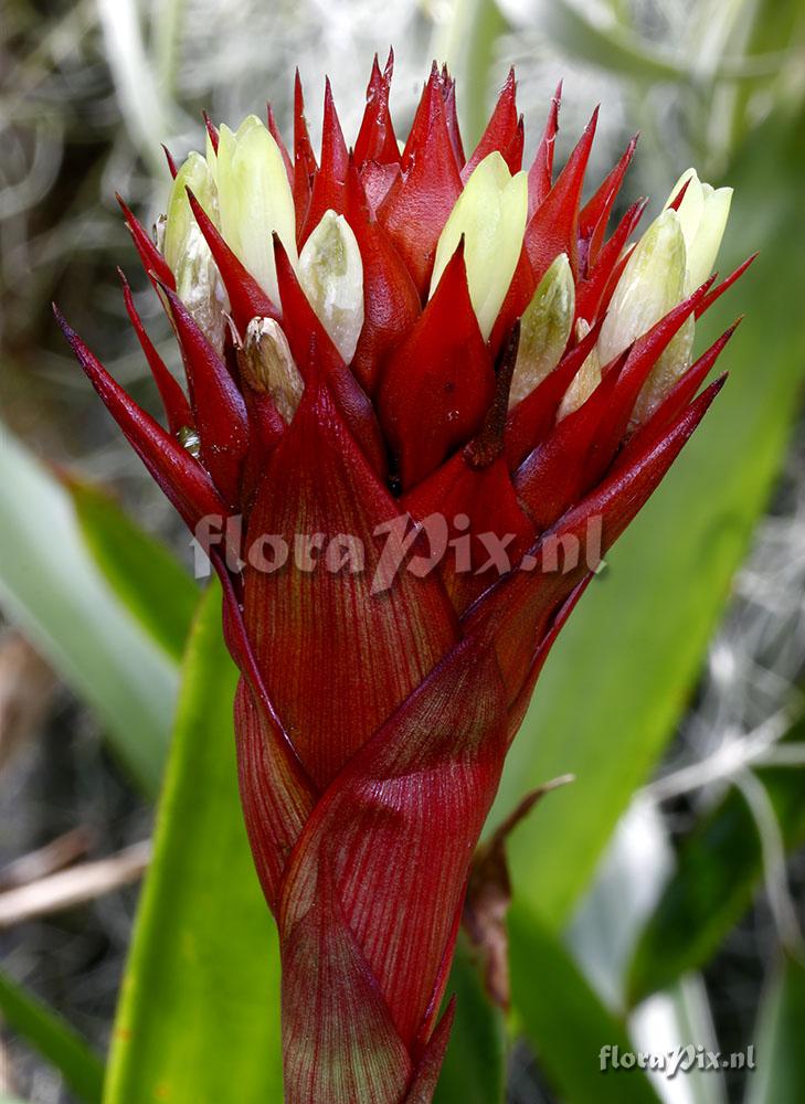 541 - Bromeliads (Garden) - 2007-03-24(Dimension: 759 x 1050 pixels - Counter: 19135) Guzmania besseae Luther ![]() Photographer: Andrew Flower Note: offset received from Dick Endt 1997, labelled "G. bessii." flowering plant 60cm, plain green leaves 4cm wide. Inflorescence 4 cm dia. Probably an offset from a plant collected in the wild by Dick. Comments on name, please. Harry: This isGuzmania besseae H.Luther native from Ecuador to Bolivia. HEL