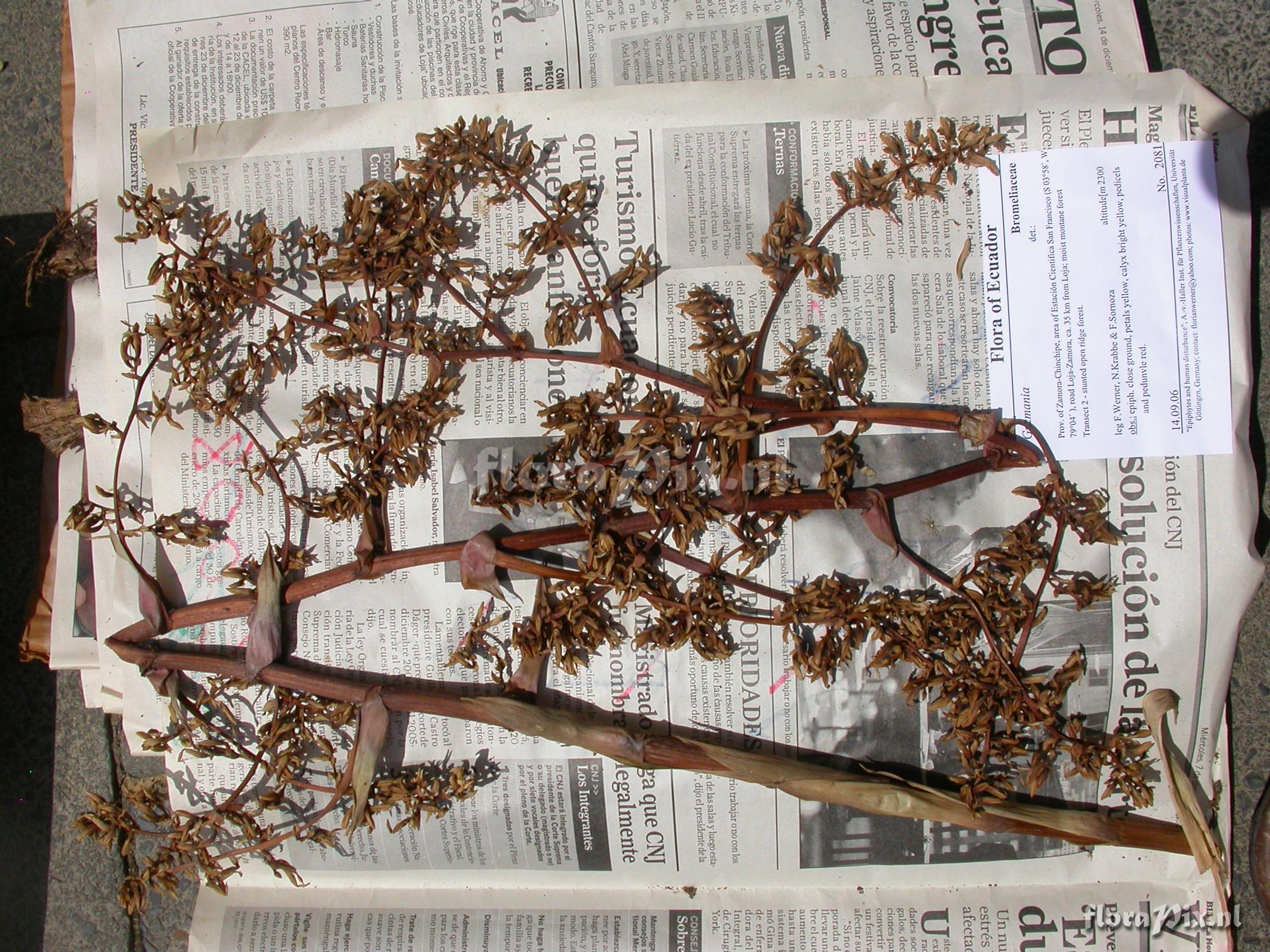 8183 - Bromeliads (Wild) - 2011-10-13(Dimension: 2302 x 1754 pixels - Counter: 9572) Guzmania cf. diffusa L.B. Sm. ![]() Locality: Ecuador - Prov. of Zamora-Chinchipe, area of Estación Cientifica San Francisco (S 03°58“, W 79°04“ ), road Loja-Zamora, ca. 35 km from Loja; moist montane forest Photographer: Florian Werner Note: Col.: Werner, F.A. 2081 (14-09-2006) - Det.: W. Till (U Vienna) 2011 petals yellow, calyx bright yellow, pedicels and pedunvle red.
