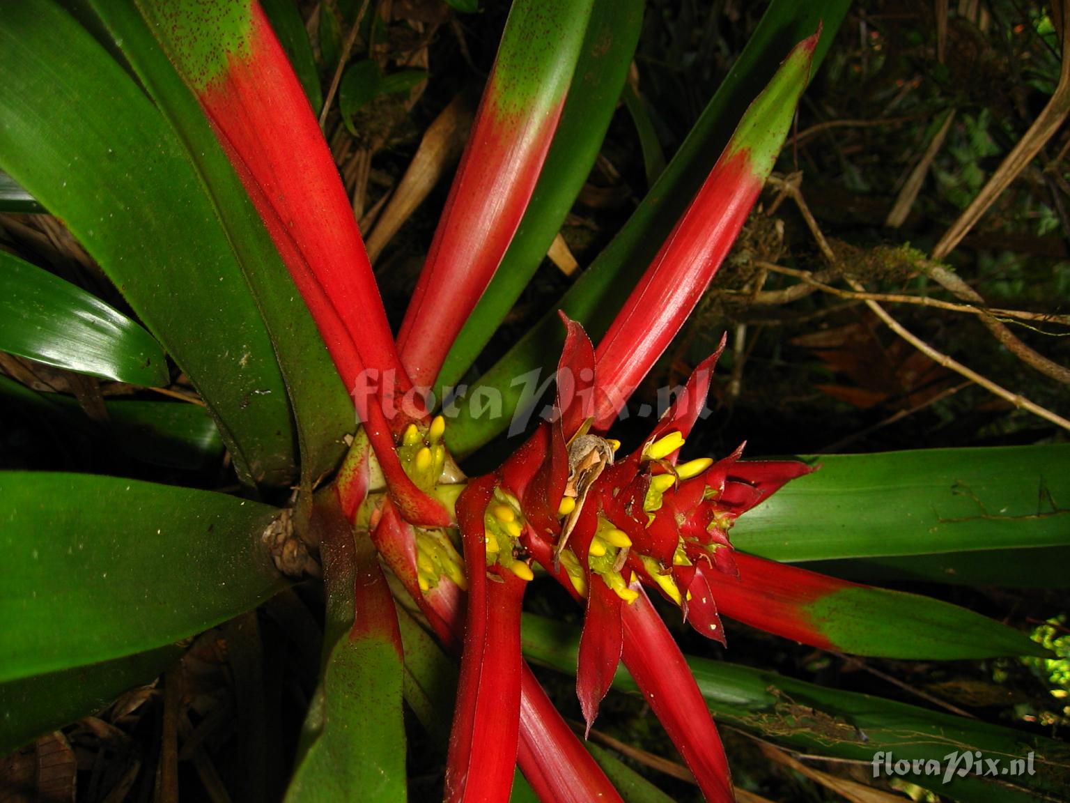 9293 - Bromeliads (Wild) - 2011-10-13(Dimension: 1566 x 2098 pixels - Counter: 10014) Guzmania kareniae ![]() (Uploaded as: Guzmania aff. sanguinea 2 ) Locality: Ecuador - Prov. of Zamora-Chinchipe, area of Estación Cientifica San Francisco (S 03°58“, W 79°04“ ), road Loja-Zamora, ca. 35 km from Loja; moist montane forest Photographer: Florian Werner Note: Col.: Werner, F.A. 1959 (23-04-2006) very much like G. sanguinea (fw1787) which grows at lower altitude and has yellow bract centers while THIS has red bract centers along with the yellow flowers. This species also has prominent fine red spotting on basal ca. third of leaves. Identification: Solved