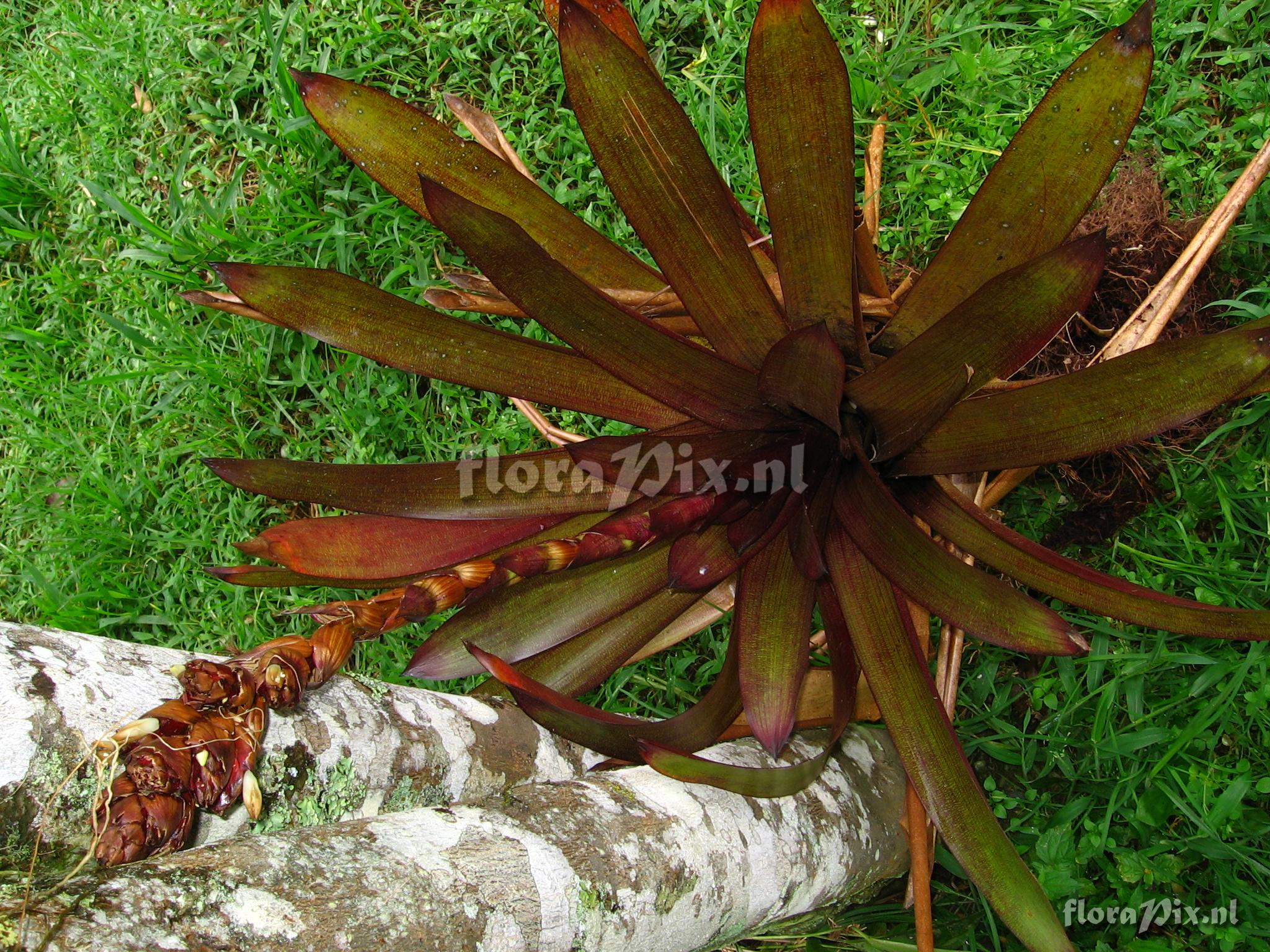 9388 - Bromeliads (Wild) - 2011-10-13(Dimension: 2078 x 1586 pixels - Counter: 13376) Guzmania sp. nov. ![]() Locality: Ecuador - Prov. of Zamora-Chinchipe, area of Estación Cientifica San Francisco (S 03°58“, W 79°04“ ), road Loja-Zamora, ca. 35 km from Loja; moist montane forest Photographer: Florian Werner Note: Col.: Werner, F.A. 1997 (12-05-2006) - Det.: H. Luther (SEL) 2007 veins and crossveins of leaves bright red, giving a locally unique fine squared pattern. Uncommon. Petals wool-white, bracts essentially reddish-brown. Finally pressed (photos) 4.6.06.