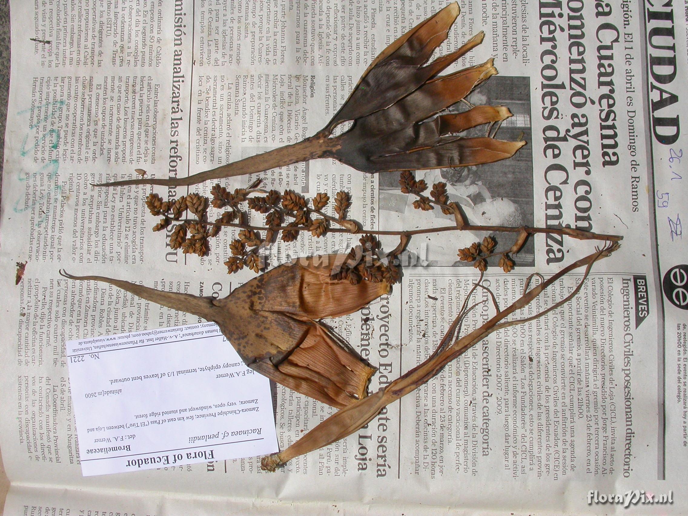 8238 - Bromeliads (Wild) - 2011-10-13(Dimension: 2302 x 1754 pixels - Counter: 7715) Racinaea penlandii var. penlandii (L.B. Sm.) M.A. Spencer & L.B. Sm. ![]() Locality: Ecuador - Zamora-Chinchipe Province; few km east of Pass (""El Tiro"") between Loja and Zamora; very open, windswept and stunted ridge forest. Photographer: Florian Werner Note: Col.: Werner, F.A. 2221 (27-04-2007) - Det.: W. Till (U Vienna) 2011 terminal 1/3 of leaves bent outward.