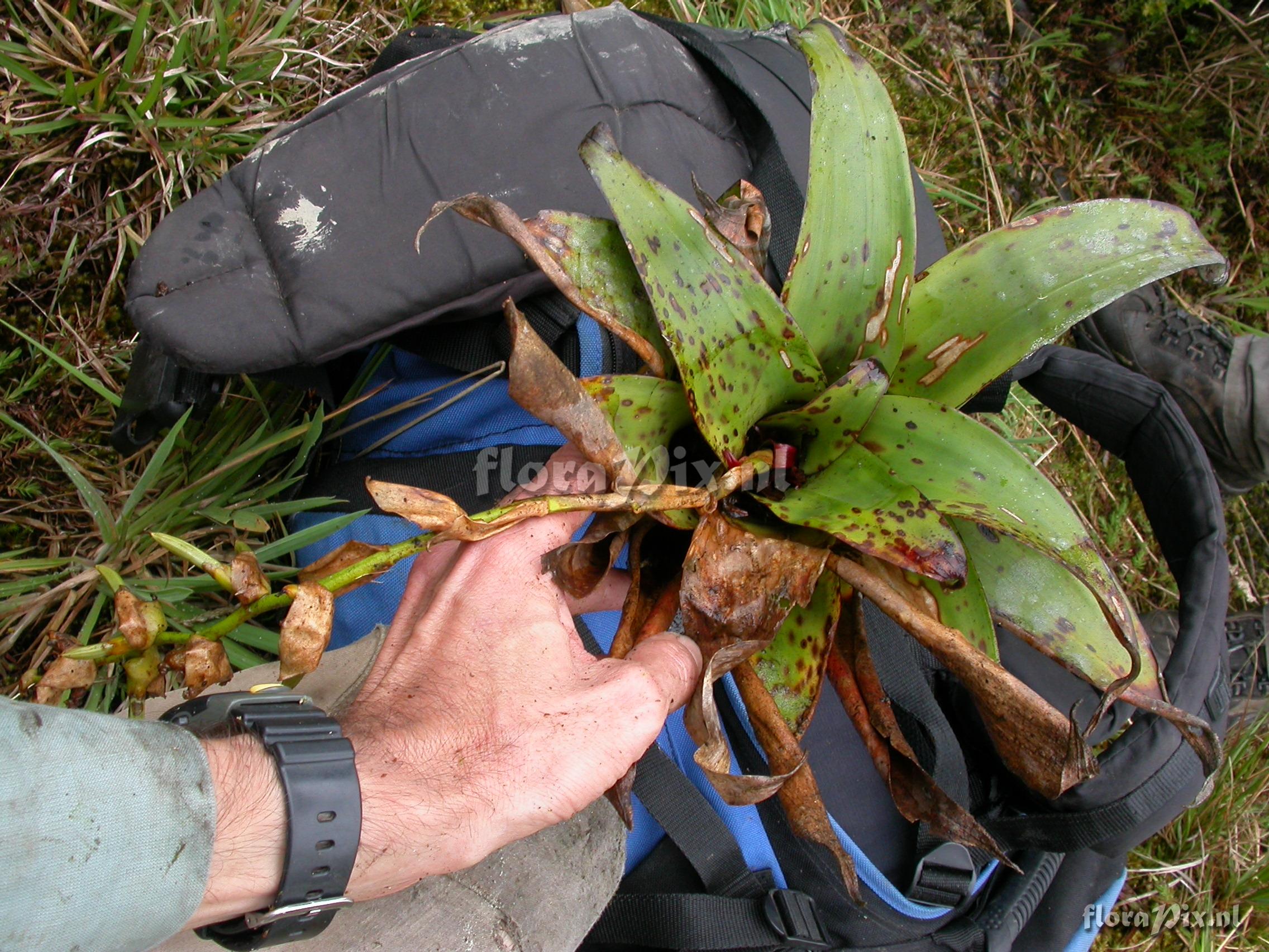 8383 - Bromeliads (Wild) - 2011-10-13(Dimension: 2302 x 1754 pixels - Counter: 7952) Racinaea tetrantha var. densiflora (Andre) M.A.Spencer&L.B.Sm. ![]() Locality: Ecuador - Prov. of Zamora-Chinchipe, area of Estación Cientifica San Francisco (S 03°58“, W 79°04“ ), road Loja-Zamora, ca. 35 km from Loja; moist montane forest Photographer: Florian Werner Note: Col.: Werner, F.A. 2513 (30-03-2008) - Det.: H. Luther (SEL) 2008 much like R. penlandi in coloration, but larger, wider, and with a more simple inflorescence.