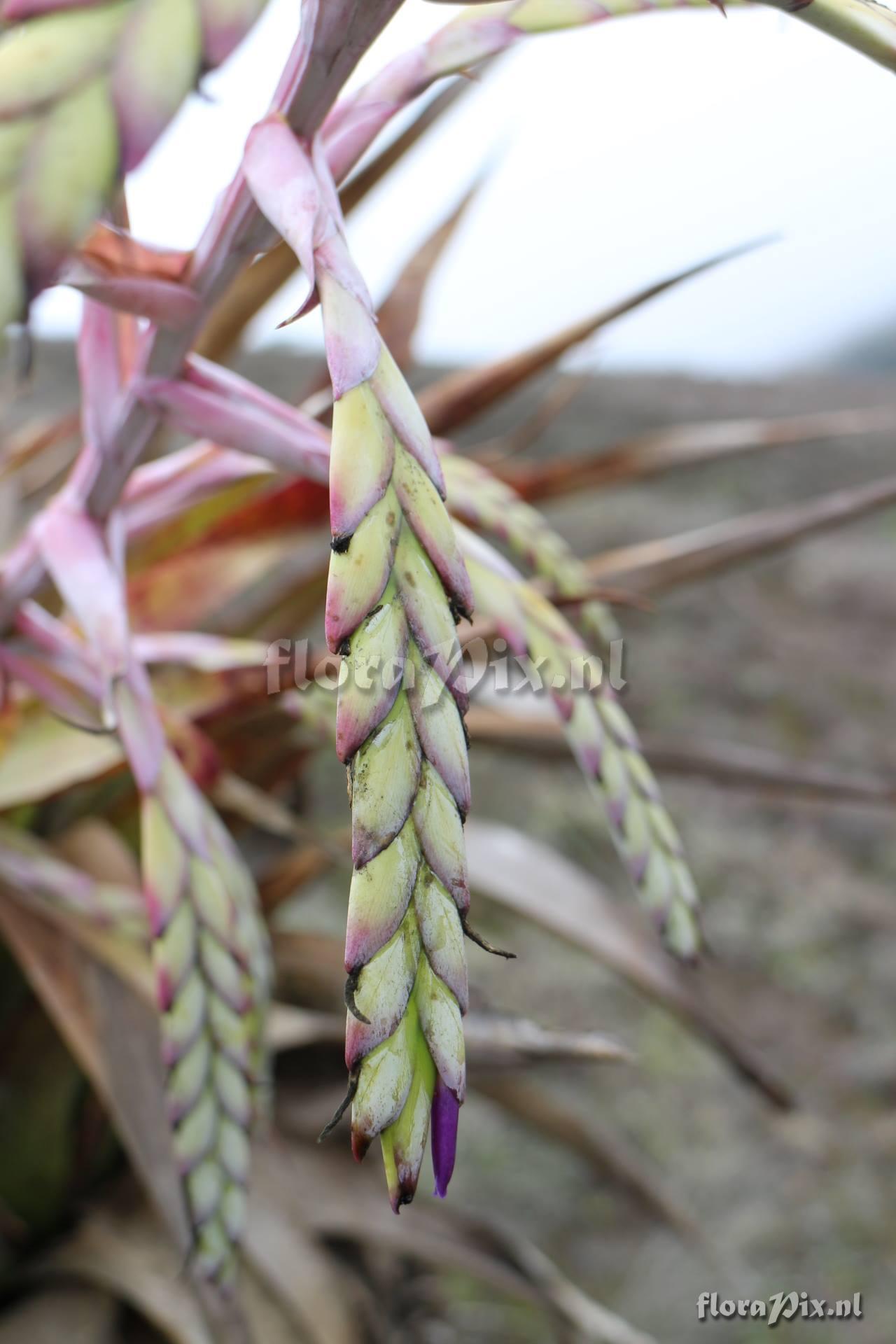 - I still believe that it is more close to Tillandsia lymanii although that species is from Peru. I'm not sure it includes T.fosteri, which seems to be much more densely flowered and with longer floral bracts. In this desert the plants flower smaller than in more humid conditions and in culture. We found a specimen with much longer pendulous spikes that was huge, like the one we grow from Cuenca-Giron - Santa Isabal near pass. (Sent: brom-l@science.uu.nl) - Identification (11405): José Manzanares (2014-04-10) =Tillandsia fosteri