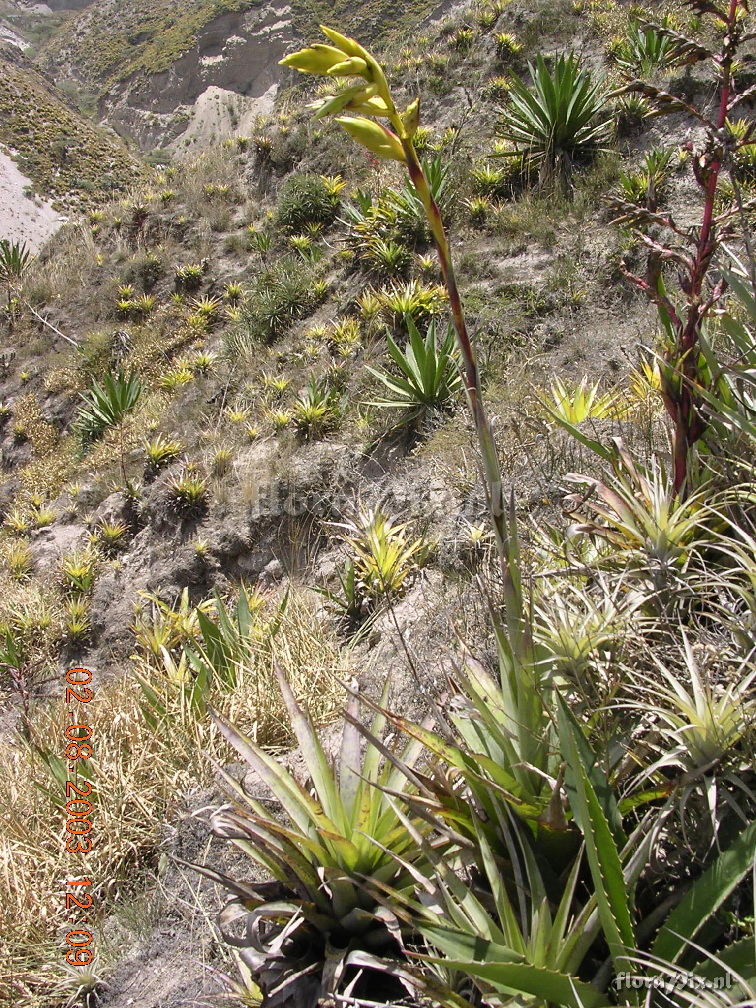 7918 - Bromeliads (Wild) - 2011-10-13(Dimension: 1566 x 2098 pixels - Counter: 10756) Tillandsia lajensis L.B. Sm. ![]() Locality: Ecuador - Province of Pichincha, Bosque Protector Jerusalén, close to Guayllabamba (S 00° 00', W 078° 21'); interandean dry forest (550 mm prec./an.) monodominated by Acacia macracantha. Photographer: Florian Werner Note: Col.: Werner, F.A. 833 (02-03-2004) - Det.: J.M. Manzanares flowers purple, bracts yellow.
