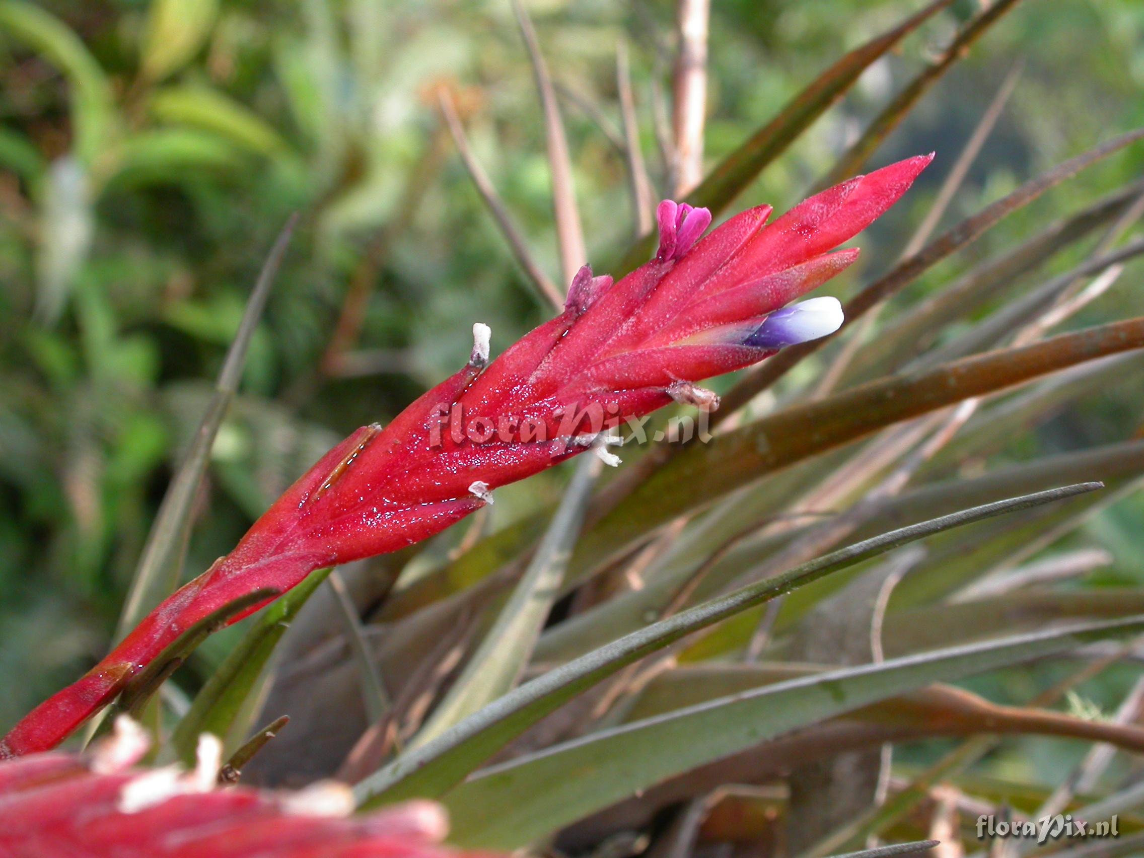 8286 - Bromeliads (Wild) - 2011-10-13(Dimension: 2302 x 1754 pixels - Counter: 8651) Tillandsia heterandra (André) L.B. Sm. ![]() Locality: Ecuador - Prov. of Zamora-Chinchipe, area of Estación Cientifica San Francisco (S 03°58´, W 79°04´ ), road Loja-Zamora, ca. 35 km from Loja; moist montane forest Photographer: Florian Werner Note: Col.: Werner, F.A. 3081 (11-09-2010) - Det.: W. Till (U Vienna) 2011 "only one large genet; bracts red, the tube-forming petals dark blue basally and white distally."