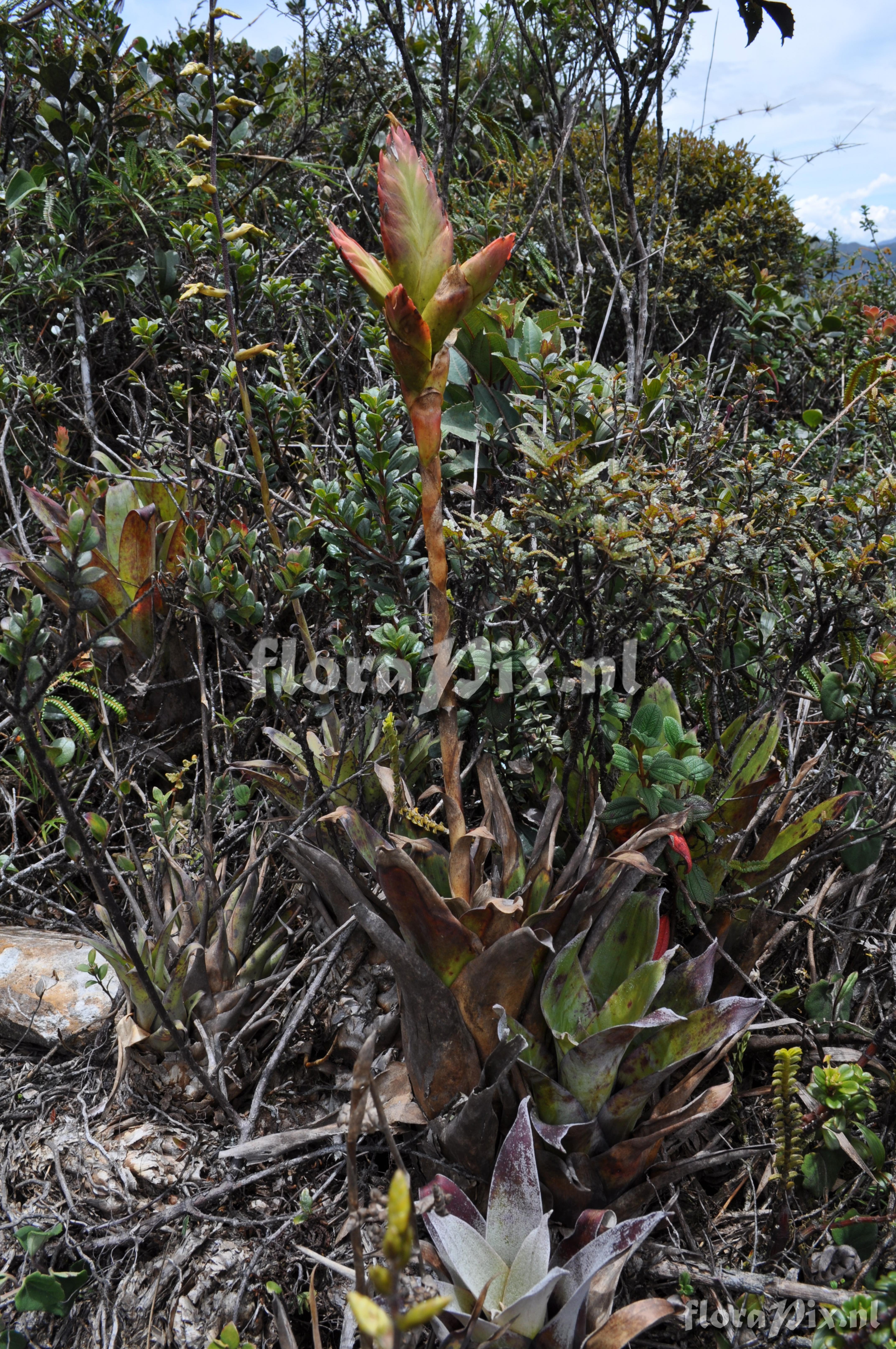 9029 - Bromeliads (Wild) - 2011-10-13(Dimension: 4318 x 2898 pixels - Counter: 7469) Tillandsia ![]() Locality: Ecuador - Prov. of Zamora-Chinchipe, area of Estación Cientifica San Francisco (S 03°58´, W 79°04´ ), road Loja-Zamora, ca. 35 km from Loja; moist montane forest Photographer: Florian Werner Note: Col.: Werner, F.A. 3115 (13-03-2011) "vegetatively a faint resemblance of T. fendleri but more erect, compact tank; blackish base of outer leaves, the glabrous abaxial leaf side also with conspicuous wax ; flower bracts compact, red, corolla light violet. Epiph. or terrestrial (in paramo)."