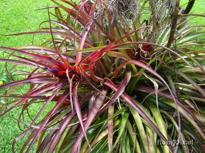 - I have made a photo in 1988 of a similar hybrid of T.capitata x T.fasciculata. It was in between T.capitata imported probably from Mexico if I remember well. Although the true identity of T.capitata is a puzzle I would say Tillandsia capitata x fasciculata (Sent: brom-l@science.uu.nl) - Note: Uncle Derek (2012-04-26) - First, I think we are dealing with a hybrid here and we are not getting very far with this. If Maria Teresa Vega does have a 'Maria Teresa L' then it would be great to see a more up-to-date photo of it so we could look at the similarity. Remember that Maria Teresa L comes from Dominica and its parents are said to be T. brachycaulos and fasciculata. BUT both these species ( and capitata) come in all colours and sizes so which clones were used? Secondly Matthias has been looking at natural hybrids for a clue and has to be extra careful here because Botanists refer to parentage as putative. At the moment I would identify it as Tillandsia hybrid (Sent: brom-l@science.uu.nl)