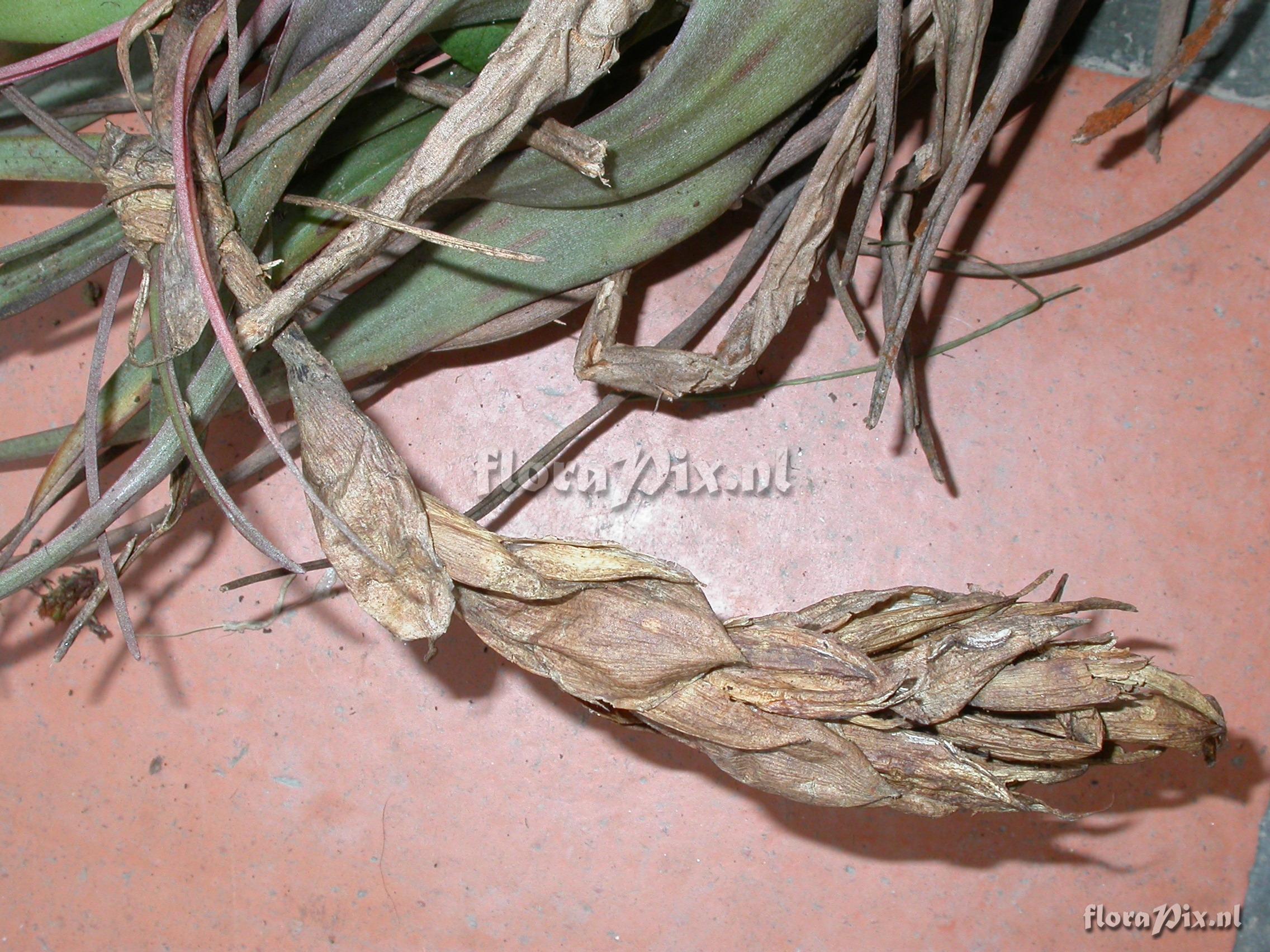 8328 - Bromeliads (Wild) - 2011-10-13(Dimension: 2302 x 1754 pixels - Counter: 9022) Vriesea limonensis Rauh ![]() Locality: Ecuador - Prov. of Zamora-Chinchipe, area of Estación Cientifica San Francisco (S 03°58“, W 79°04“ ), road Loja-Zamora, ca. 35 km from Loja; moist montane forest Photographer: Florian Werner Note: (as Werner, F.A. 1962 ) - Det.: H. Luther (SEL) 2007 "greyish type; infl. pending: bracts bright light orange, petals apple-green. Leaves full of trichomes which adaxially in the basal (""tank"")-half are hairy and brown.; strong fibres in leaves."